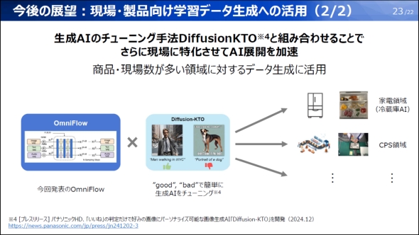パナソニックHDは、データから実装まで一貫したAI開発プロセスの高度化に取り組んでおり、これまでに学習データのアノテーションを効率化するマルチモーダル基盤モデル「HIPIE」や「SegLLM」、FastLabelとの協業で構築したアノテーションプラットフォーム、生成AIチューニング技術「Diffusion-KTO」などを開発している。これらのうちDiffusion-KTOは、OmniFlowとの組み合わせにより商品や現場数が多い領域に対するデータ生成の活用に適しているという。