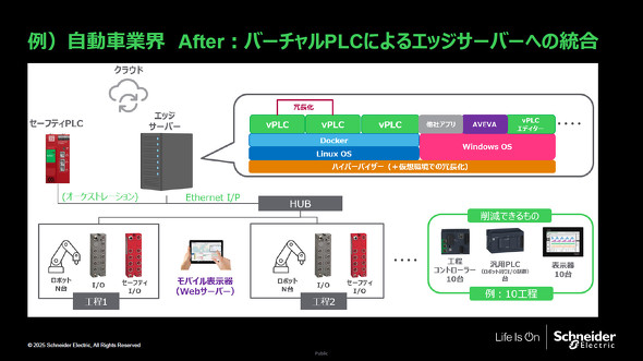 Automation Expertは既に国内の自動車関連の工場で導入事例があるという。従来の工場では、工程ごとにコントローラーや表示器が置かれていたが、“可能な限りハードウェアを減らしたい”というユーザーの要望を受けて、バーチャルPLCなどを導入し、既設のラインにあったハードウェアを大きく削減することに成功した。「ハードウェアがなくなることによるコスト削減に加えて、メンテナンスコストの削減にもつながる。OTの制御プログラムを作る人材が減り続けている中で、SDAによってITの人材も活用できるようになる」(扇芝氏)。