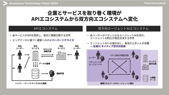 さらに、ユーザー一人一人がAIエージェントを持つようになれば、AIエージェント同士のやりとりも増えていくと山根氏はいう。その中で他社のAIエージェントと自社のAIエージェントを連携させることも考えられ、GoogleはAIエージェント同士が自律的に情報交換するためのプロトコルを発表している。自社のAIエージェントの開発/活用と、顧客が持つ他社のAIエージェントのエコシステムでコラボレーションしていくことの両立が求められるという。
