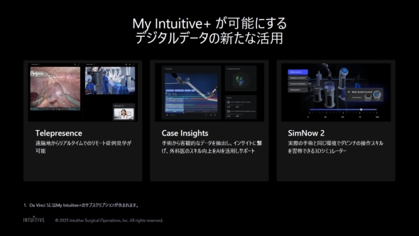 1つ目の「Telepresence」と使えば遠隔地からリアルタイムでのリモート症例見学が可能になる。2つ目の「Case Insights」は、手術から客観的なデータを抽出してインサイトにつなげ、外科医のスキル向上をAI(人工知能)でサポートする。3つ目の「SimNow 2」は3Dシミュレーターで、実際の手術と同じ環境でダビンチの操作スキルを習得できる。