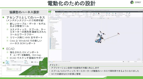 具体的には、協調型ハーネス設計機能の強化が図られており、「今回のバージョンでは、ハーネスをアセンブリとして扱うことで、Creoの得意とする大規模アセンブリ機能をケーブル設計にも活用できるようになった」(財前氏)という。