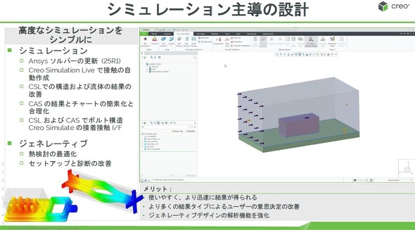 また、AI駆動によるジェネレーティブデザインにおいては、新たに熱解析がサポートされ、従来対応していた静解析や固有値解析に加え、マルチフィジックス解析が可能になった。「ジェネレーティブデザインによる形状生成からAnsysのソルバーによる解析まで、Creo単体で設計から評価まで完結できることがCreoの強みだ」と財前氏は語る。