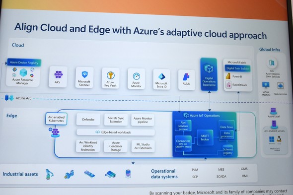 説明担当者は「Azure Arcでは、現場にどんな設備があり、その設備からどのようなデータを吸い上げているかなど、現場のデータソースやデータそのものを管理できる。Azure Arcでクラウドとエッジの両方を透過的に管理しながら、ものによってはクラウド側で作ったアルゴリズムを現場のPCに実装し現場のエッジ側でAIやSLM(小規模言語モデル)を動作させ、一方で『LLM(大規模言語モデル)を使いたい』『全体をつなげてみたい』『別の工場と並べて比較したい』といった場合はクラウド側で行う、といった使い分けができるようになる」と語っていた。