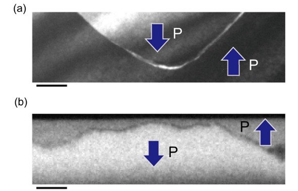 HHとTTの界面にはそれぞれ正および負の分極電荷がたまると考えられている。図2は、実際にタンタル酸リチウム結晶内部のドメインを電子顕微鏡により観察した像となる。電子回折実験による詳細な解析の結果、図2の(a)(b)はそれぞれ上側と下側のドメインの分極方向が反対方向を向いていた。つまり、これらのドメイン界面はそれぞれHHおよびTT界面であると考えられる。