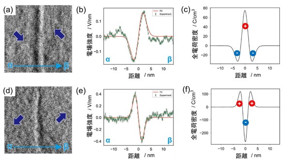 これらの界面に対して、tDPC法による電場観察を行った像と電場強度のラインプロファイルが図3だ。図3の(b)(e)ではHH界面とTT界面の電場方向が完全に逆転していることが分かった。HH界面では界面の中心から電場が湧きだすように発生しているのに対して、TT界面では界面の中心方向に電場が収束するように発生していることが明らかになった。