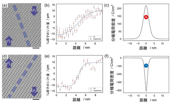 次に、OBF法を用いてドメイン界面近傍の原子変位を詳細に計測し、分極量変化を見積もった。その結果が図4だ。図4の(b)(e)はドメイン界面を横切る過程で、(b)(e)原子変位がピコ(1兆分の1)メートルオーダーで大きく変化している。この変位量から分極電荷を導き出した結果が図4の(c)(f)だ。原子変位計測からも、HHおよびTT界面においてそれぞれ正、負の分極電荷が形成することが示唆された。