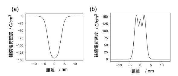 図5 tDPC法で導出した図3の全電荷密度分布から、OBF法により求めた図4の分極電荷分布を差し引いた補償電荷のみの電荷密度分布プロファイル。(a):HH界面、(b):TT界面。HH界面とTT界面では補償電荷が逆符号となっている[クリックで拡大] 出所:JST