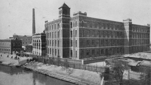 ※2)図4の写真はプラットのカタログにあったもの。1888年に建設されたれんが造り4階建ての工場で、ここに384錘建リング精紡機72台と540錘建くず糸ミュール精紡機2台から成る第2次増設紡績機械が設置された。手前側にある建物が第3工場で、煙突の下にれんが造り3階建ての第2工場が写っている。のこぎり屋根の第1工場は写っていない。