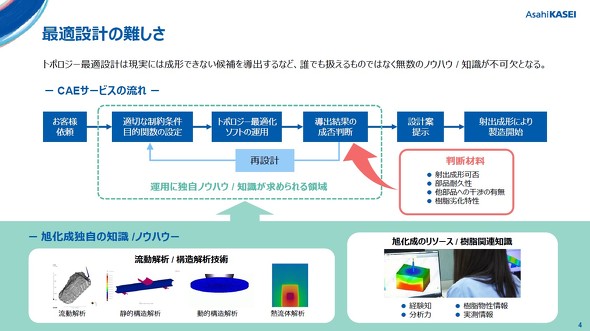旭化成は、長年培ってきた樹脂の知見とCAE技術のノウハウを生かし、「CAEサービス」を立ち上げ、PoCを通じた展開を進めている。中でも、軽量化に効果を発揮するトポロジー最適化の活用に注力しており、これまで接点のなかった顧客層も含めて、設計支援の取り組みを外部にまで広げていく方針だ。