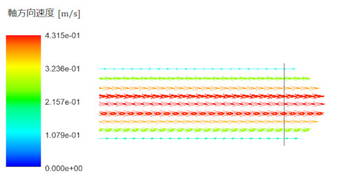 図11に出口近傍における速度ベクトルを示します。また、図12には軸方向の速度分布を示しています。