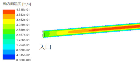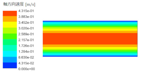 今回は、入り口の境界条件として、入り口断面における速度を一様としました。これは、大きなタンクに細い管をつないだ状態をイメージしたものです。このような入り口近傍の一様な流れが、放物線状の層流へと変化するまでの区間のことを「助走区間」と呼びます。