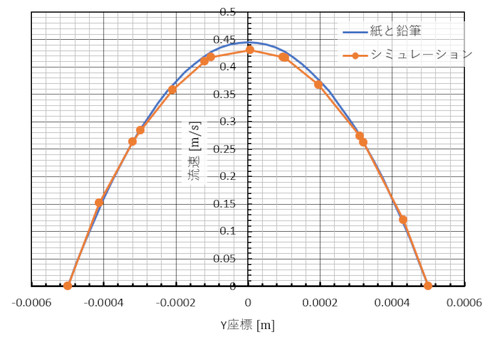 図15に軸方向流速を示します。紙と鉛筆による流速は、前回の式21によるものです。紙と鉛筆による結果と、CAE解析の結果は非常によく一致しました。層流においては、理論値とシミュレーション結果を一致させることは、案外難しくありません。
