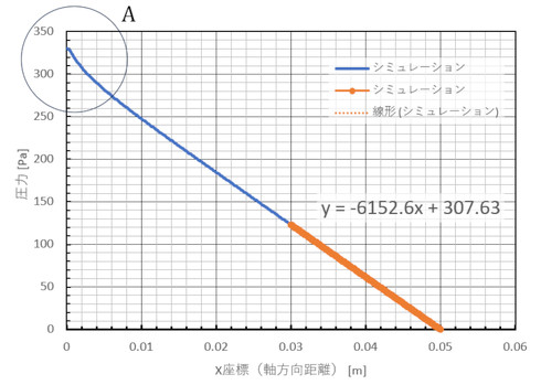 図16に圧力分布を示します。A部が直線でありません。助走区間において、圧力損失が大きくなっていることが分かります。