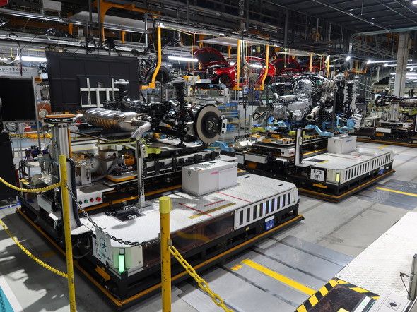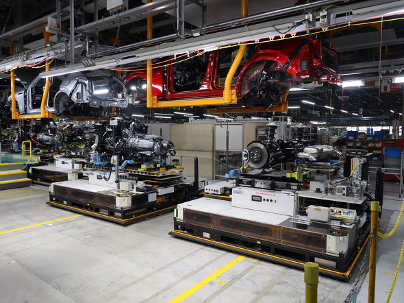 EVの専用工場をつくらないと宣言したマツダ。さまざまなパワートレインの車両を混流生産すれば、EV専用工場の新設に比べて設備投資を大幅に抑制できる、というのがその理由だ。ラージ商品群や電動化に合わせて導入した最新の混流生産はAGVがカギを握る。