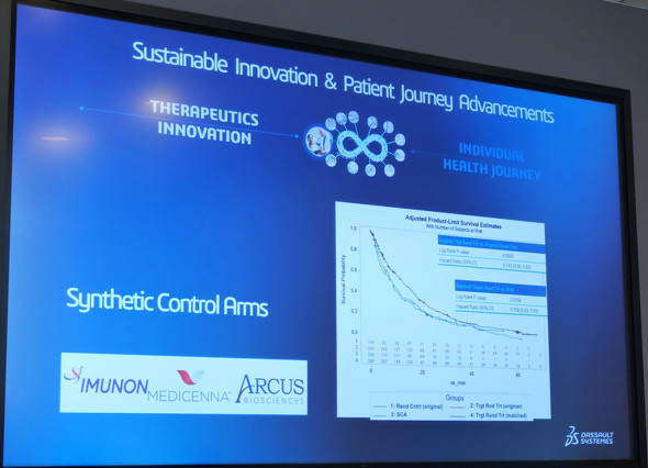 「この分野における臨床データ活用のリーダーが、ダッソー・システムズの子会社であるMedidata Solutionsだ」とビオ氏は述べる。Medidata Solutionsは、過去に実施された多数の治験データを保有しており、それらを活用して「バーチャルペイシェント(仮想患者)」を生成。これを実際の対照群の代替として使用する手法が、「合成対照群(合成コントロールアーム)」と呼ばれる。