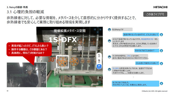 日立プラントサービスが施設管理を行うルネサスエレクトロニクスの工場で行った1週間の検証では、Naivyを使うことで発生したトラブルに対して適切なワークフローを選択するまでの時間が14分から10分に短縮され、28%の業務遂行能力向上効果を確認した。また、「今までうまく聞けなかったことが簡単に聞けて助かる」「聞きたいときに質問ができて心強い」といった心理的負荷軽減効果も見られたという。