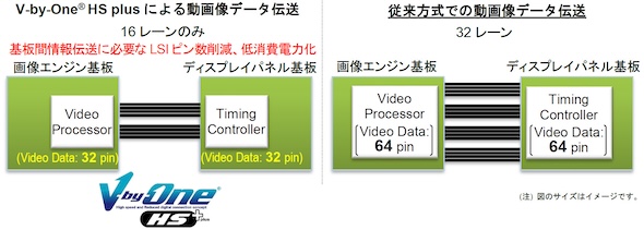 同技術は、4K/8Kテレビなどの高品質ビデオ信号機器内伝送において、事実上の世界標準となる「V-by-One HS」を発展させた次世代標準技術だ。1レーン当たり最大8Gbpsで、高解像度および高フレームレート化に対応。ケーブルやコネクター、LSIの小型化、最適化により、システムコストや消費電力、基板面積を削減する。
