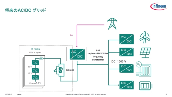 インフィニオンテクノロジーズ ジャパン インダストリアル&インフラストラクチャーI2) 事業本部 マーケティング部 部長の藤森正然氏は「この1MW超の時代には、増大するCO2排出量削減への対応が必要になるため、外部電源とともにAIデータセンター内に設置している再生可能エネルギーの電力を直接利用できるようにグリッドを整備する必要が出てくる」と説明する。そこで求められるのが、直流電力を双方向にやりとりできるSST(半導体変圧器)と、直流電力を高速に遮断できるSSCB(半導体遮断器)である。