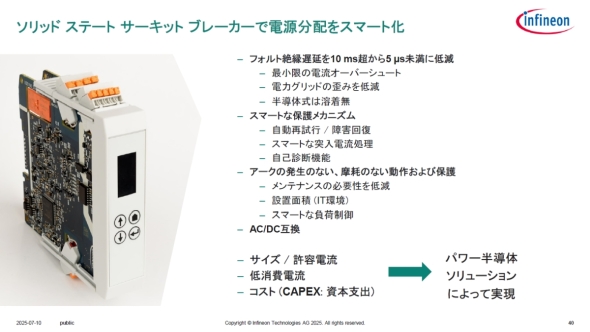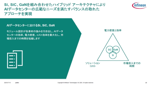 なお、これらAIデータセンター向け電力供給システムで多く用いられているのはシリコンパワー半導体だが、250kW超の電力供給におけるIBC向けではGaNデバイス、1MW超のSSTやSSCBではSiCデバイスの適用が想定されている。後藤氏は「高速スイッチングであればGaN、高耐圧であればSiCなど、最適な技術の組み合わせでAIデータセンターの広範なニーズを満たせるハイブリッドアーキテクチャもインフィニオンの強みになるだろう」と述べている。