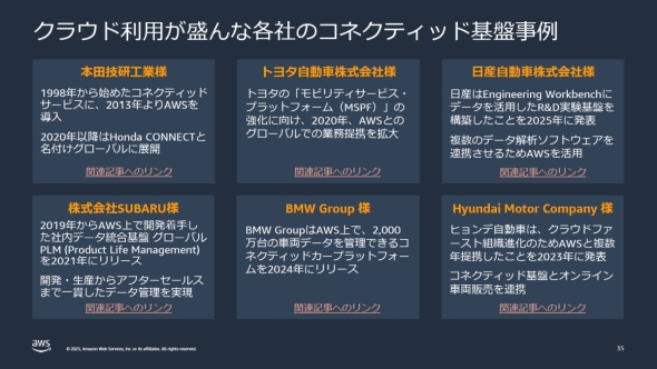 AWSが早い段階から自動車業界の採用で実績を積み上げてきたのは、モビリティサービスの車両データ収集/管理などに用いられるコネクテッド基盤である。ホンダはコネクテッドサービス向けに2013年からAWSを採用しており、トヨタ自動車も2020年に「モビリティサービス・プラットフォーム(MSPF)」の強化に向けAWSとの提携拡大を発表している。同様のモビリティサービスの基盤としてBMWグループやヒョンデ(Hyundai Motor)にも採用されている。SUBARUは、2021年に社内データ統合基盤となるグローバルPLMをAWSに構築したことを発表しており、開発/生産からアフターセールスまで一貫したデータ管理を実現しているという。