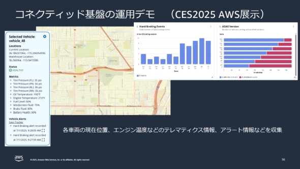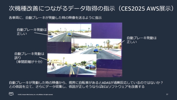2025年1月開催の「CES 2025」では、AWSがコネクテッド基盤の運用デモを披露している。梶本氏は「このデモでは、地図上のある場所で急ブレーキすることが増えるという事態に対して、ADASをアップデートしたタイミングと同期しているという分析結果を得た。そこで、急ブレーキ時にカメラデータを取得するように各車両に指示することで、車両周辺の自転車に反応しているという要因を導き出し、即座に開発対応することで改善できることを示した」と説明する。