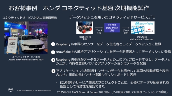 また、AWS Summit Japan 2025では、ホンダがコネクテッド基盤の次期機能試作である「Honda Data Mesh」に関する展示を行った。この次期機能試作は、分散型/ネットワーク型のデータプラットフォームであるデータメッシュをコネクテッド基盤で実現するためのもので、Raspberry Piを搭載するミニチュア車両のセンサーデータを、データメッシュプラットフォームの「snowflake」と連携させる内容になっている。「Raspberry Pi車両のセンサーをデータ生成者としてデータメッシュに登録し、非構造化データを収集してそれらのデータに対するタグ付けなどを自動化した上でデータメッシュに取り込み、データ消費者として登録したsnowflake上の解析アプリケーションに配信するという仕組み。解析アプリケーションが加速度センサーのデータを積分して車両の移動経路を表示するとともに、車両の他センサー情報も表示できることを確認できており、コネクテッド基盤としてのデータメッシュの有効性を確認できた」(梶本氏)としている。