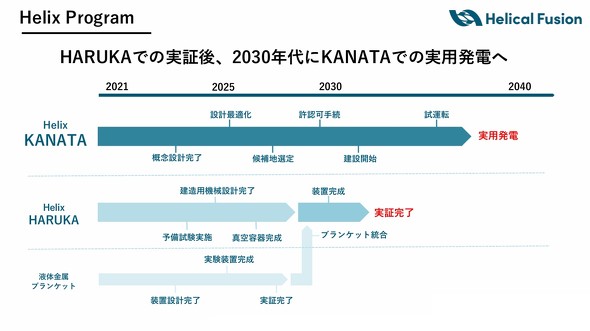 Helix Programでは、「日本でもうひとつ太陽をつくろう。」をコンセプトに、2030年代の前半にヘリカル型核融合の最終実験装置「Helix HARUKA」を完成させ実証を完了することや、2030年代の後半に50〜100MWを発電するヘリカル型核融合の初号機「Helix KANATA」の試運転と実用発電を行うことを計画している。