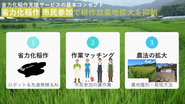 今回の実証プロジェクトは、「省力化稲作」「作業マッチング」「農法の拡大」を組み合わせることで省力化稲作支援サービスの実現につなげることが目標となる。