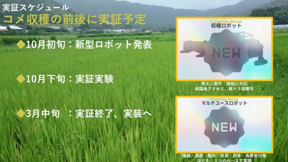 まず省力化稲作では、テムザックが延岡市でのロボット稲作で実証してきた雑草抑制ロボット「雷鳥1号」などの成果を基に開発した収穫ロボットやマルチユースロボットを米収穫時期である2025年10月に発表し、実証実験を行う。収穫ロボットについては、今回の実証プロジェクトで実施する農法である再生二期作や陸稲に対応可能で、軽トラで運搬可能な重量やサイズとする方針だ。マルチユースロボットは、さまざまな農作業に対応する機能を1台で実現できることを目指すが、当初は鳥獣害対策と部分的な除草の機能を組み込む予定である。