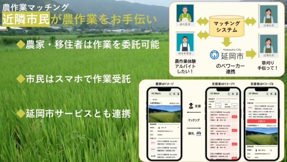 省力化稲作支援サービスの実現に向けて重要な役割を果たすのが作業マッチングだ。今回の実証プロジェクトは、あくまで稲作の省力化であり、ロボットを活用しても半自動化までが可能であり、完全自動化は見据えていない。つまり、現地でのロボット管理をはじめ農作業を担う人が必要になる。そこで作業マッチングでは、延岡市における農林業と新しい人材をつなぐマッチングサイトである「のべワーカー」と連携し、近隣市民に農作業を手伝ってもらう枠組みを構築する。この作業マッチングのスマートフォンアプリの開発はパルシベイトが担当する。