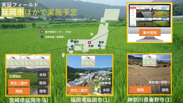 実証フィールドの広さは、圃場の数は延岡市が6枚(1枚当たりの面積は1反=10a)、福岡県福岡市の九州大学試験農場が1枚、神奈川県秦野市三廻部地区が1枚となっている。京都市の集中管制センターでは、これら遠隔地の圃場におけるロボットや農作業の管理を行う。