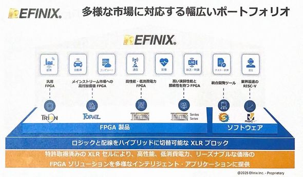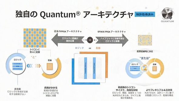 エフィニックスは特許取得済みの独自のFPGA技術「Quantum」アーキテクチャにより、こうした課題に対応した。この技術はロジックと配線の配置を決め打ちにするのではなく、切り替え可能なロジックおよびルーティング(XLR)セルにより、ロジックと配線を裏表で切り替えて使い分けるようなイメージで使用できる。ソフトウェア制御により、XLRセルをロジックで使うか配線で使うかを選択できるため、柔軟で効率的な設計が可能となる。これにより従来と比べて使用面積を抑えることが可能になり、値段も低価格化できる。さらに、電力も抑えることが可能になる。