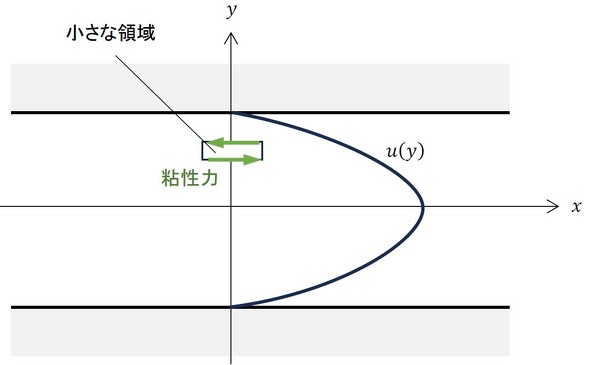 この分布は放物線の形をしています。ここで、小さな流体の領域を1つ考えてみましょう。中心付近は流速が速いため、その領域の下辺は進行方向に引っ張られます。この引っ張る力を「粘性力」と呼ぶことにします。一方、壁面では流速がゼロなので、領域の上辺は壁に引き止められようとする力を受けます。このときの粘性力は、先ほどとは逆向きになります。