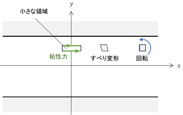 小さな領域の上辺と下辺に働く粘性力の方向が逆になるため、図3に示すように、その領域は平行四辺形のように変形します。このとき、流体の分子と分子は互いにすべり合っている状態になります。金属の塑性変形における「すべり」と似たようなものと考えています。