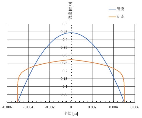 では、速度分布を計算してみましょう。図5に、円管内部の速度分布を示します。ここでは、層流と乱流で流量を同じにしています。速度分布はかなり違いますね。