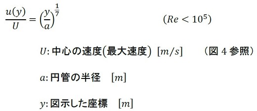 では、図2に示した層流の円管速度分布に対応する、乱流の円管速度分布はどうなるのでしょうか。これについては、「1/7乗べき則」と呼ばれる経験則があります。乱流の速度分布は、式3で近似されます(参考文献[1])。