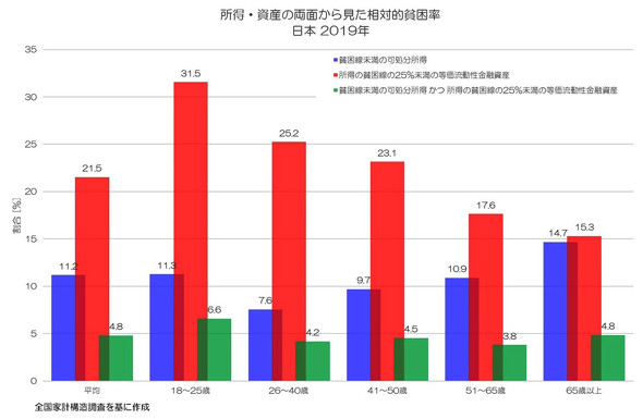 具体的に、日本の状況を統計データで確認してみましょう。図4が2019年の日本の所得と資産の両面から見た相対的貧困率です。
