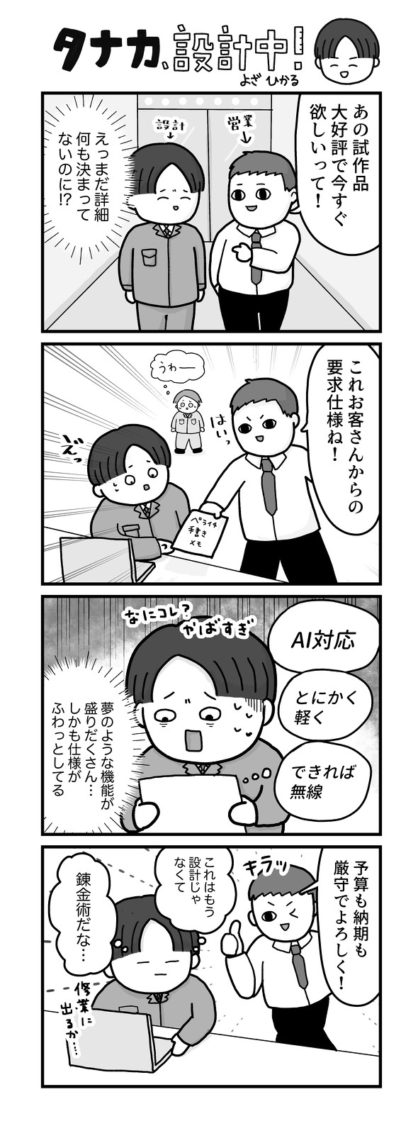 「タナカ、設計中!」は、読者の皆さまから寄せられた“設計現場のあるあるエピソード”を題材に制作した4コマ漫画企画となります。まずは4コマ漫画をご覧いただき、以降のページで皆さまから寄せられたエピソードを各コマのイラストとともに紹介していきます。ひょっとするとあなたのエピソードが採用されているかも!? ぜひ最後までご覧ください! ⇒あるあるエピソードの投稿はこちら(絶賛、募集中!!)