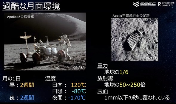 月面探査機は過酷な月面環境に対応するように開発されている。月は昼が2週間で、夜は2週間となる他、温度は日向が120℃、日陰が−80℃、夜間が−170℃となる。重力は地球の6分の1で、放射線は地球と比べて50〜250倍、表面はサイズが1mm以下の砂に覆われている。