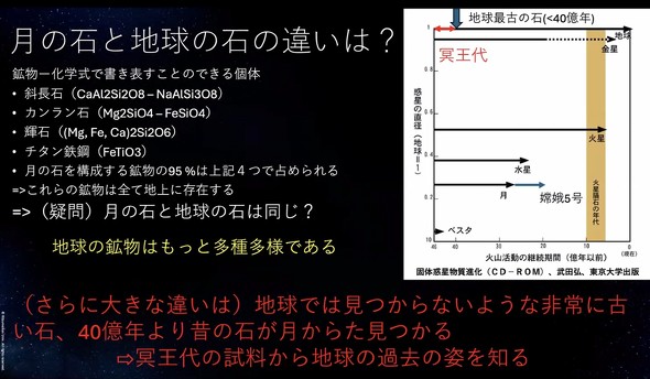 月のリターンサンプルの95%以上は、斜長石、カンラン石、輝石、チタン鉄鉱で構成されている。「月の石と地球の石の大きな違いは、水などが存在するため地球の石が月の石と比べて多種多様である点だ。月の石の中には、地球では見つからないような非常に古い石がある点も違いとなる。冥王代である40億年以上前の石が月から見つかっている。そのため、冥王代のサンプルから地球の過去の姿を知ることができる」(長岡氏)。月や地球の石の年代測定は、放射性同位体元素の放射性同位体の量とその半減期から行うという。