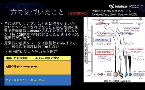 長岡氏は「この研究を進める中で、射出時の圧力から推定し、月隕石の起源クレーターが直径数km以下と小さく、深度は数百mと浅いことにも気づいた。つまり、年代が若いサンプルは月面に残りやすいが、古いサンプルになればなるほど、隕石衝突の影響で表面情報が取り除かれており、一部のサンプルだけでは月の地殻全体などについて研究することが難しいと分かった」と述べた。