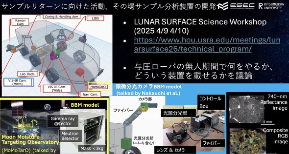 その場で始原地殻を分析するために必要とされるのは、ロボットアーム、研削機構、ガンマ線中性子分光計、広域分光カメラ、岩塊調査/資料選別用の顕微分光カメラ、サンプル判別アルゴリズム、サンプルコンテナ、輸送技術だ。ガンマ線中性子分光計、広域分光カメラ、岩塊調査/資料選別用の顕微分光カメラ、サンプル判別アルゴリズムはESECも研究開発している。「ESECでは、アルテミス計画で使用される有人与圧ローバーにこれらの技術を搭載し、始原地殻のサンプル獲得を実現したいと考えている」と語った。