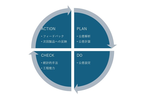 さらに重要なのは、「設定した公差の結果として、実際に加工されたものがどうであったかを確認し、その結果を設計にフィードバックする」というフローです。これを「公差設計のPDCA」といいます(図1)。