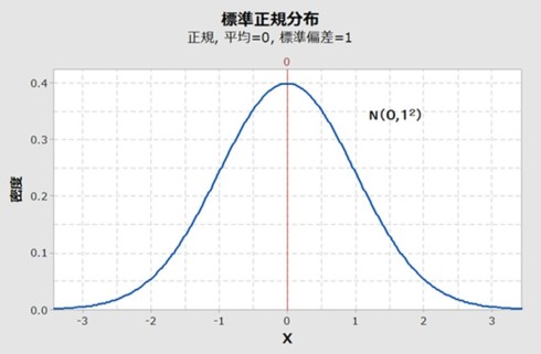 正規分布とは、データが平均値を中心に左右対称にバラつく、滑らかな山形のグラフです。このうち、特にシンプルな形のものが「標準正規分布」と呼ばれます。平均値(μ)=0、標準偏差(σ)=1のとき、この分布を「N(0,12)」と表記します。