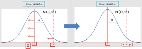 標準正規分布表を使用するためには、正規分布を標準正規分布へ変換する、標準化を行う必要があります。そのイメージを図6に示します。