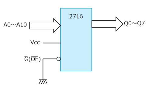使い方は簡単で、あらかじめ2716の中にデータを書き込んでおき、あとはG(OE:Output Enabled)をGNDに落とした上でつなぐだけである。この場合A0〜A10のアドレスが入力、Q0〜Q7のデータが出力になり、11ビット入力、8ビット出力のロジック回路に化けるわけだ(図2)。