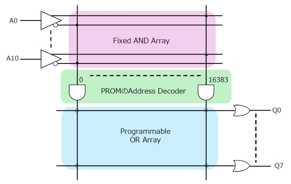 このPROMの等価回路が図3である。A0〜A10はまずFixed AND Arrayを経由し、その結果が(PROMのAddress Decoder経由で)アドレスとしてProgrammable OR Arrayに渡される。PROMに書き込んだデータというのは、要するにアドレスに対する出力のビットパターンをORの形で記録しているので、これがQ0〜Q7に引き渡されるというわけだ。