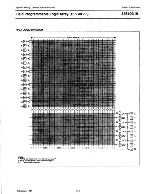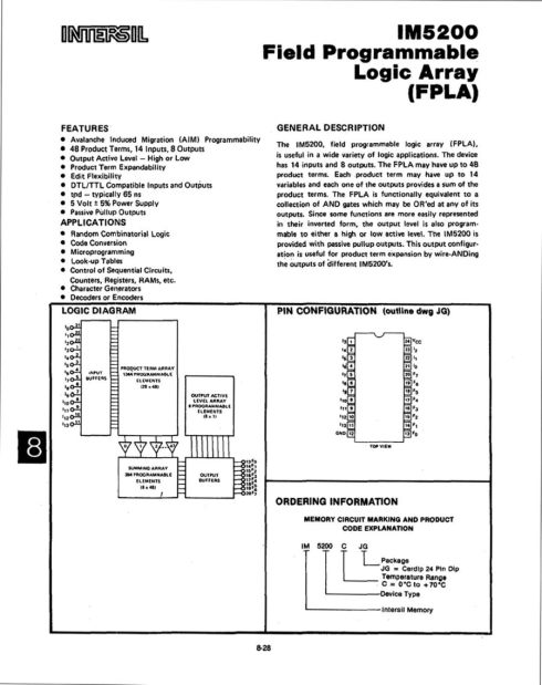 1975年、英Signeticの82S100 FPLA(図3)と、Intersil IM5200 FPLA(図4)という2種類のPLAが世の中に登場した。82S100は16入力/8出力、IM5200は14入力/8出力のプログラマブルロジックである。
