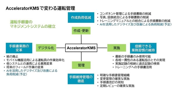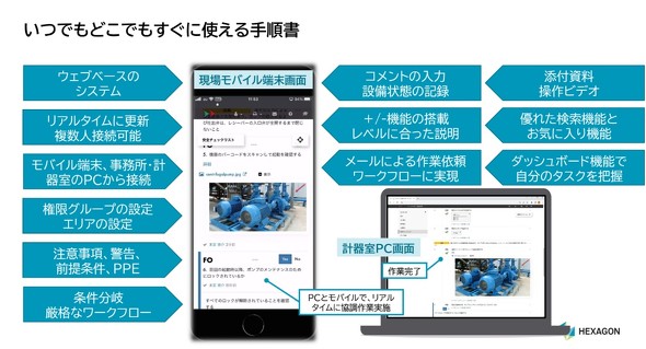 また、AI(人工知能)のサポートにより、画像やテキストなどを組み合わせた手順書を作成できるオーサリング機能と運転員からのフィードバック機能を搭載している。手順書の変更管理や承認フロー、改訂履歴の可視化にも応じる。マルチデバイス対応で、スマートフォンやタブレット端末でも使える。