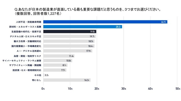 製造業が直面する最大の課題としては「人材不足、技能継承」が46.9%と圧倒的に多く、これに「原材料、エネルギーコストの高騰」(28.2%)、「生産設備の老朽化」(19.8%)が続いた。製造業の成長戦略として有効と考えられるものでは、「高付加価値の素材、製品開発」(14.1%)や「人材教育、リスキリング」(12.0%)が挙がっている。経営層や管理職では、11%が「AI技術の本格活用」を選択した。